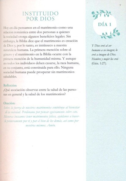 Los devocionales son cortos pero muy poderosos, perfectos para leer en pareja. Me gusta cómo está estructurado, con letras grandes que facilitan la lectura. El tiempo de entrega fue adecuado y el empaque muy cuidado. Me siento muy satisfecha con este libro. ¡Una gran compra!